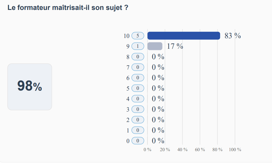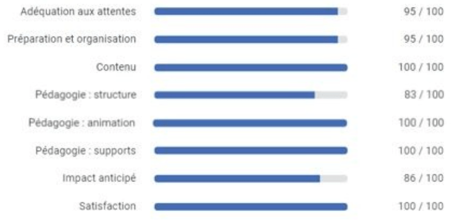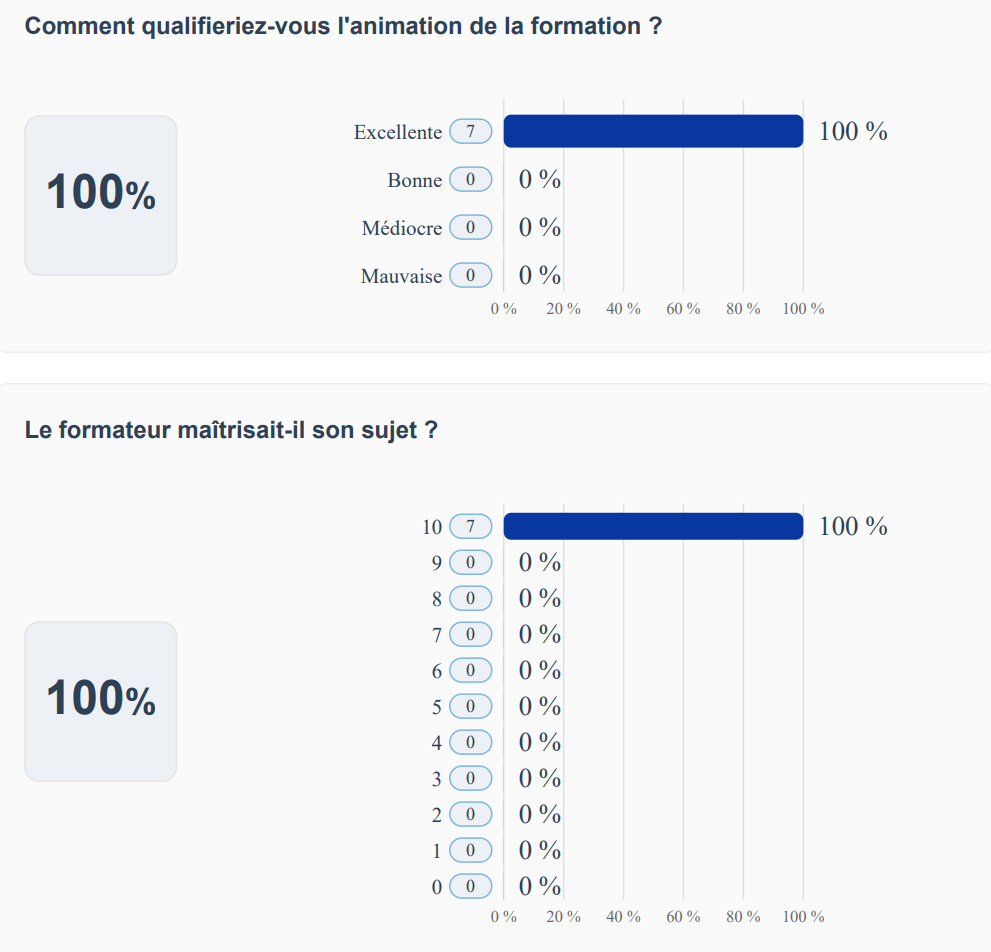 « 1 : La formatrice crée un climat de confiance grâce à son expérience professionnelle, ce qui nous permet de progresser sereinement. 2 : Le fait que chacun vienne avec les mêmes préoccupations liées à la prise